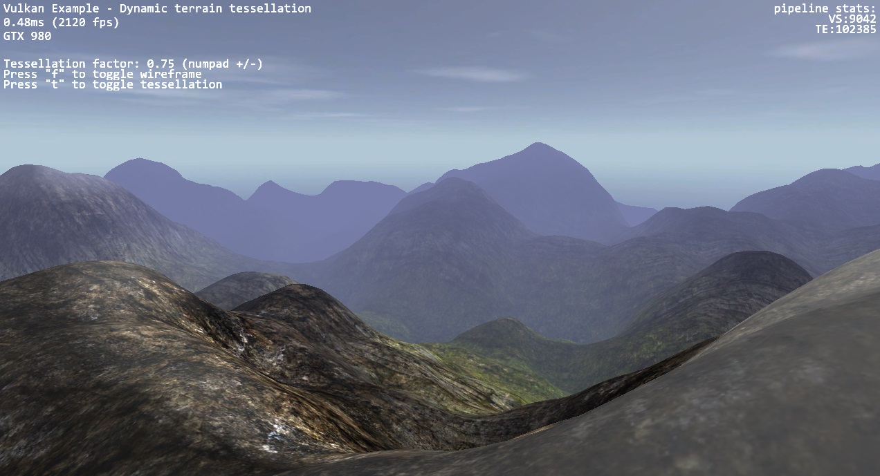 Renders a terrain with dynamic tessellation based on screen space triangle size, resulting in closer parts of the terrain getting more details than distant parts. The terrain geometry is also generated by the tessellation shader using a 16 bit height map for displacement. To improve performance the example also does frustum culling in the tessellation shader.