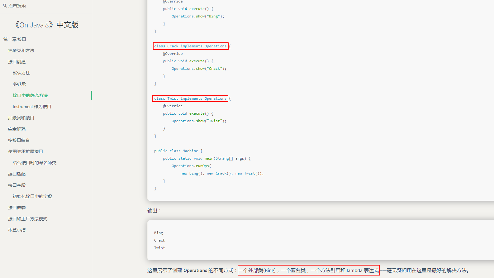【这里展示了创建 Operations 的不同方式:一个外部类(Bing),一个匿名类,一个方法引用和 lambda 表达式——毫无疑问用在这里是最好的解决方法。】: