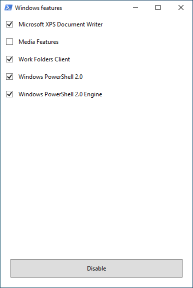 - Disable Windows features displaying friendly packages names with pop-up form written in WPF;