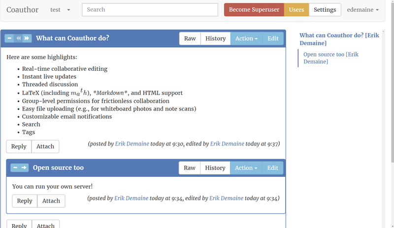 Coauthor is a tool for group collaboration, discussion, keeping track of notes/results of meetings, etc. Its primary goal is to ease multiauthor collaboration on unsolved problems in theoretical computer science, so e.g. you'll find LaTeX math support; hopefully it will have applications in other fields too.