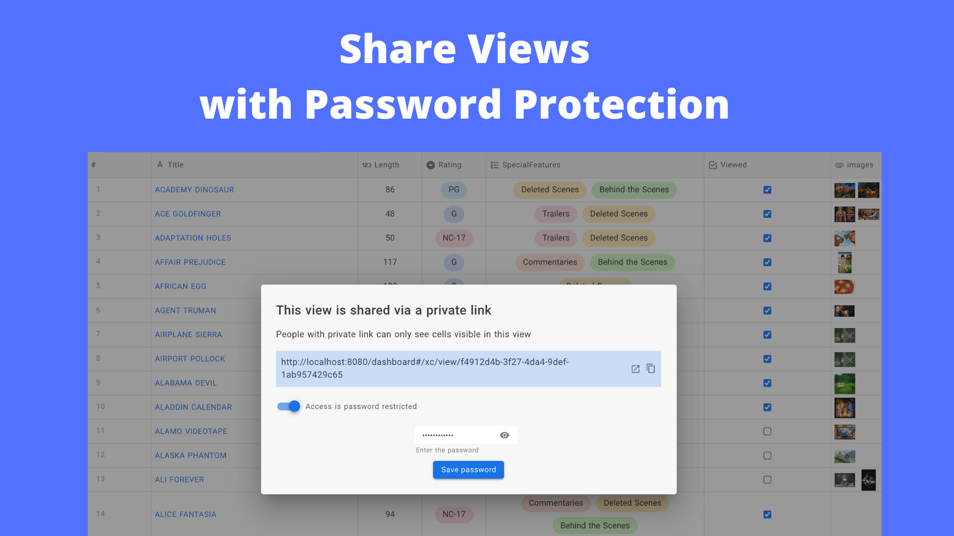 • ⚡  Share Views : public & password protected