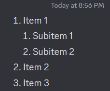 Ordered lists and nested ordered lists are supported by Discord, despite Markdown Text 101 not showing such.