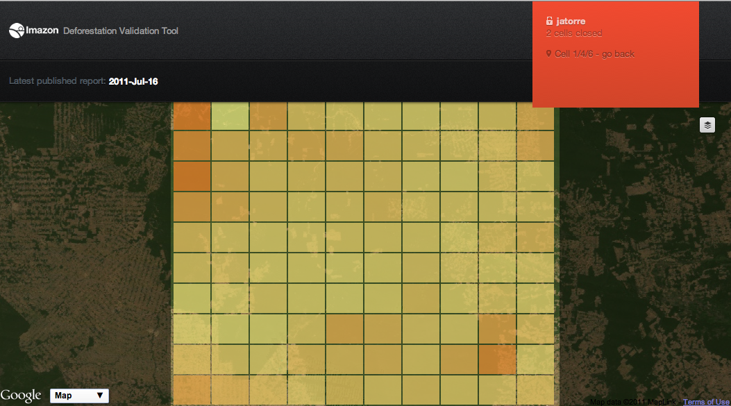 This is a highly specialized application to track deforestation on the Amazonas. More specifically, it is a tool to do validation of deforestation detected by algorithms using satellite imagery. The algorithm and the methodology has been developed by Imazon (TODO: links to scientific papers). The frontend and the application architecture has been developed by Vizzuality and updated by Google. The backend support for Google Earth Engine has been provided by David Thau.
