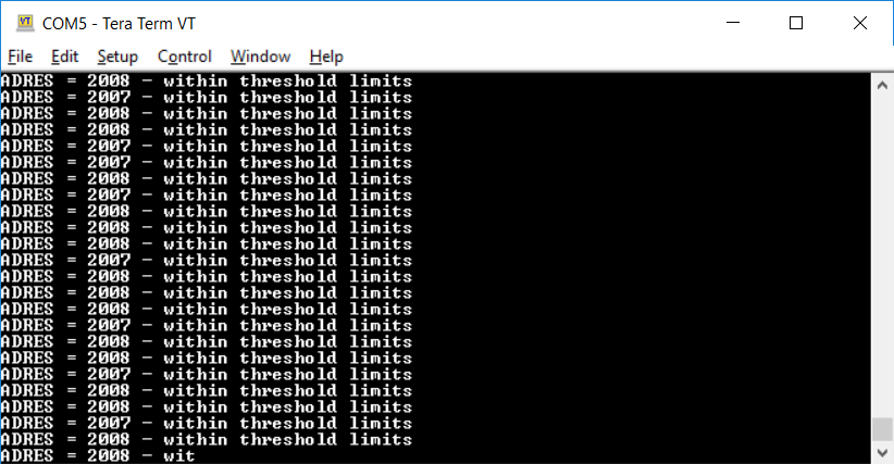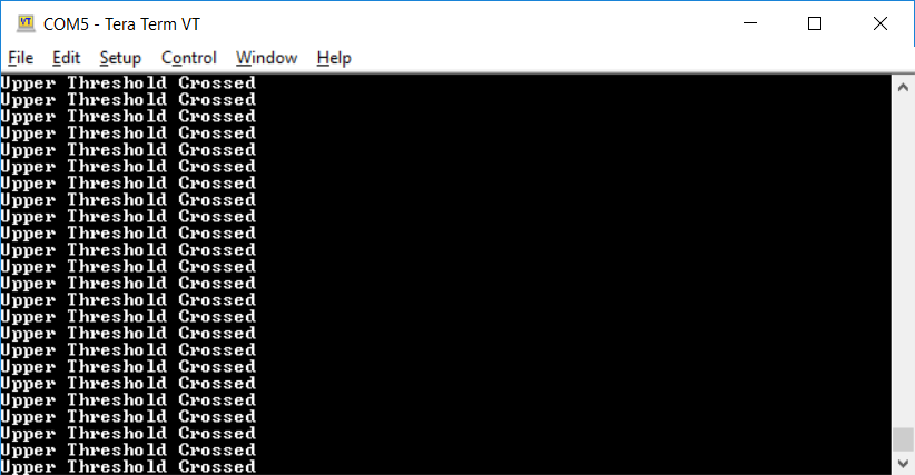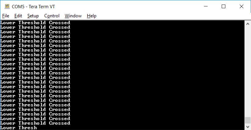 For Basic, Average, and Burst-Average modes, a user-defined setpoint is compared to the conversion result. The difference, or error, is compared to an upper and lower user-defined threshold, and if the error is within the threshold boundaries, the ADRES value is displayed. If the error is out of the threshold boundaries, the threshold that was violated is displayed. In Basic mode, no threshold testing is performed, and only the current ADRES value is displayed. For these three modes, the potentiometer is used as the ADC input. Turning the potentiometer to the left or right changes the potentiometer’s resistance, which changes the input voltage to the ADCC. The ADRES values in these modes represent the input voltage received from the pot.