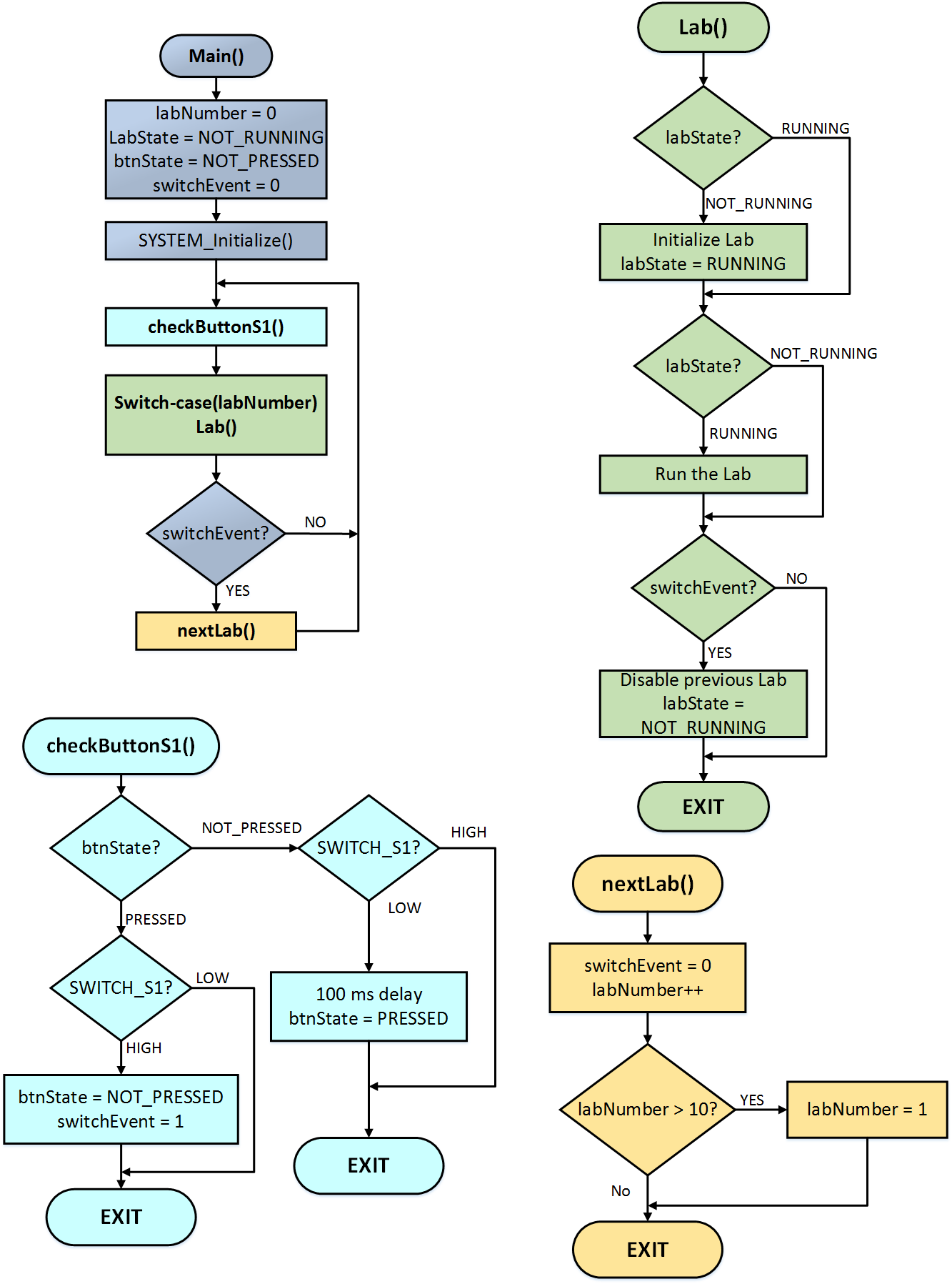 This example also make use of the latest MPLAB Code Configurator (MCC v3.75), an easy-to-use plugin tool for MPLAB X IDE(v5.10) that you can use to generate codes for a more efficient use of the CPU and memory resources. All labs are written in C language and are compatible with the latest XC8 compiler (XC8 v2.00).