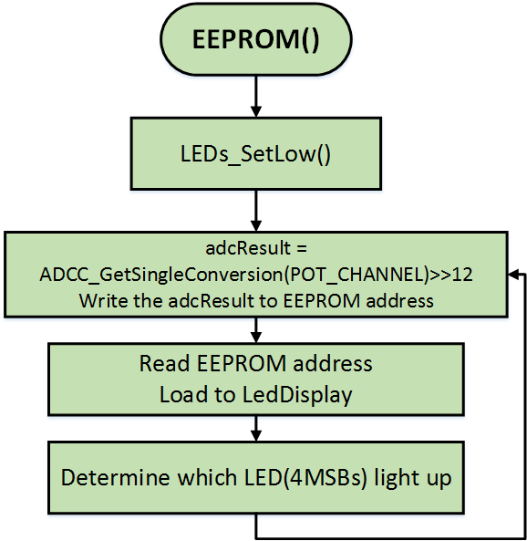 In this lab, the top 4 converted MSB value of the ADC from the potentiometer input is written on the EEPROM. The value written on the EEPROM is then read and displayed on the LEDs D2-D4.