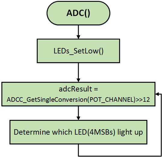 This lab shows how to configure the ADC, run a conversion, read the analog voltage controlled by the on-board potentiometer, and display the high order four bits on the LEDs.