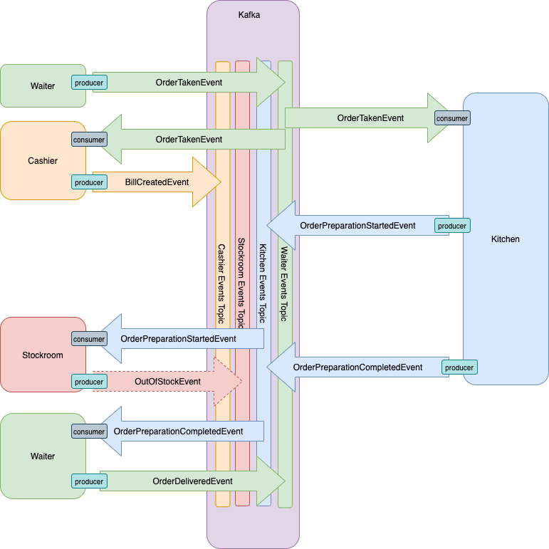 Sample project that demonstrates an event driven architecture backed by kafka. The system consists of 4 microservices: waiter, kitchen, stockroom and cashier. Each service is built on top of the Axon Framework and uses Event Sourcing for persistence.