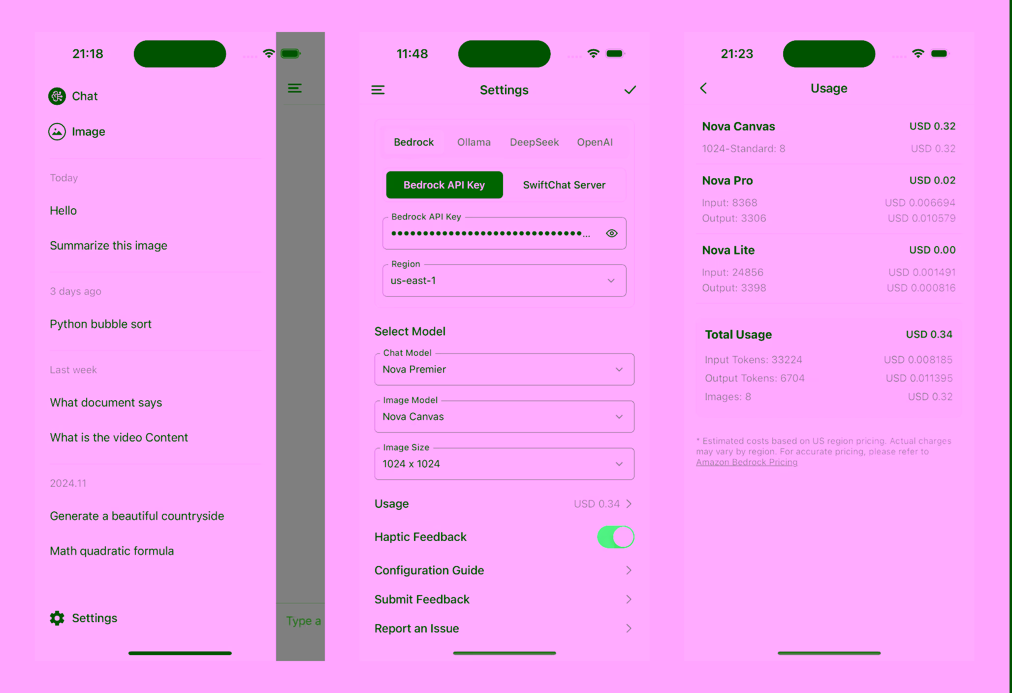 SwiftChat is a fast and responsive AI chat application developed with React Native and powered by Amazon Bedrock, with compatibility extending to other model providers such as Ollama, DeepSeek, OpenAI and OpenAI Compatible. With its minimalist design philosophy and robust privacy protection, it delivers real-time streaming conversations, AI image generation and voice conversation assistant capabilities across Android, iOS, and macOS platforms.