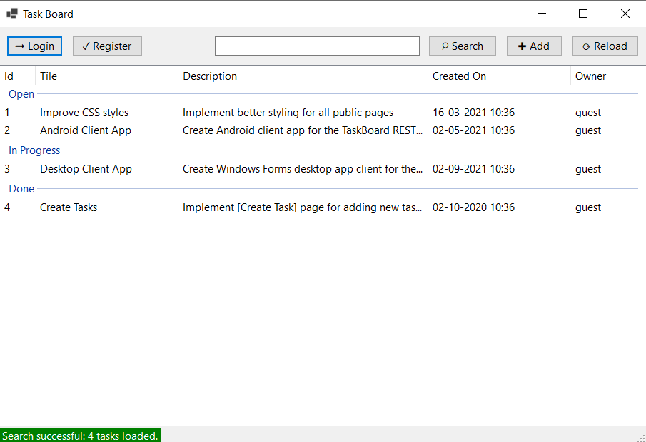 The ASP.NET Core app "Task Board" holds a board of tasks (in Trello style). Each task consists of title + description. Tasks are organized in boards, which are displayed as columns (sections): Open, In Progress, Done.