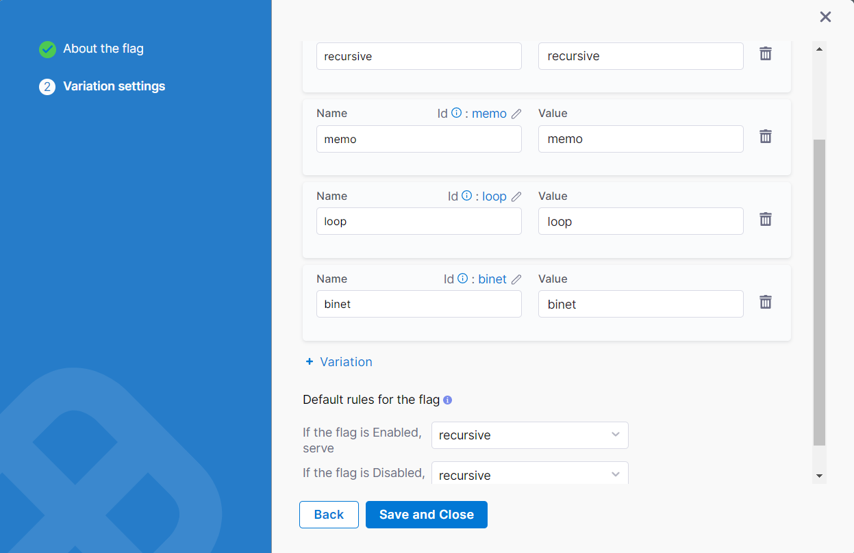 fib-algo. Enabled the feature and add arecursive,memo,loop,binet, anddefaultvariation values. Confirm thatrecursiveis the control value and set it to 100%.