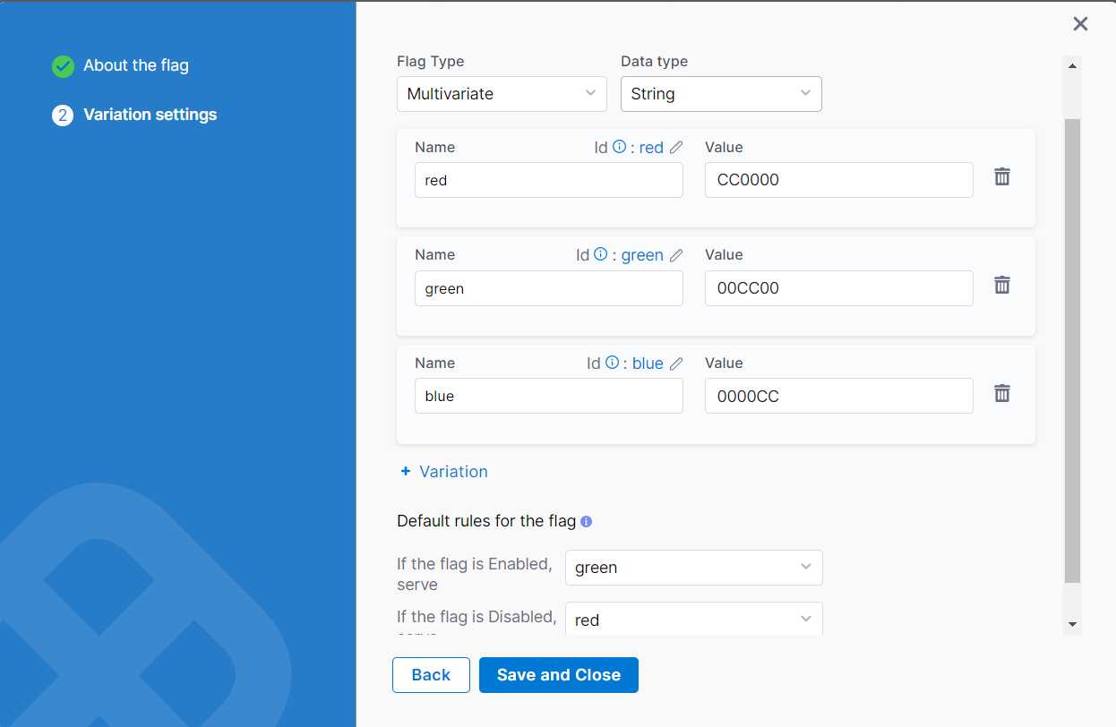 hex-color. Set the flag variations tostringand add three variations with the following variation and name:c05543- red,2f5230- green, and0d507b- blue. -