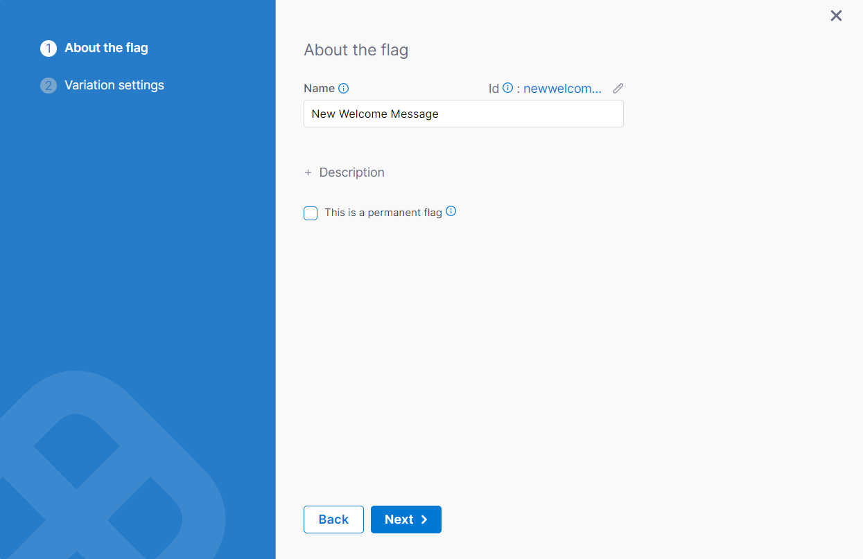 new-welcome-message. Enabled the feature and add atrueandfalsevariation values. Confirm thattrueis the control value and set it to 100%.