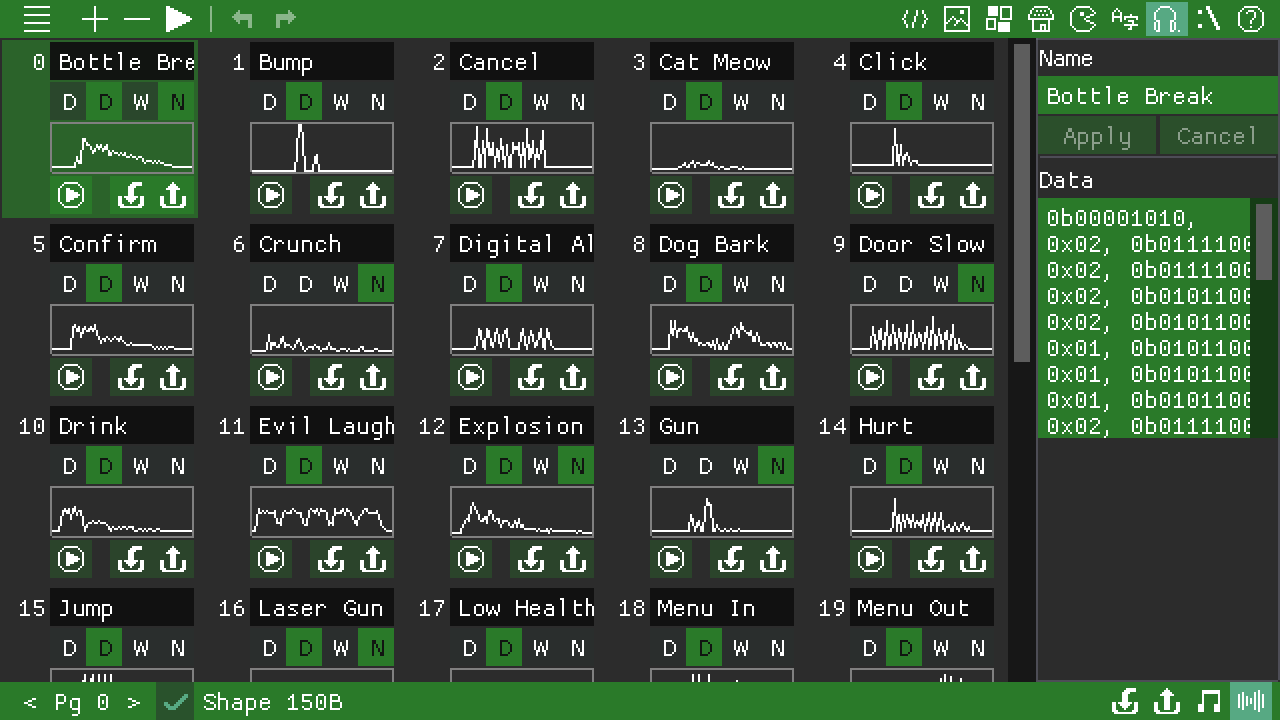 - Audio: 4 channels; supports importing from JSON, VGM, WAV, FxHammer