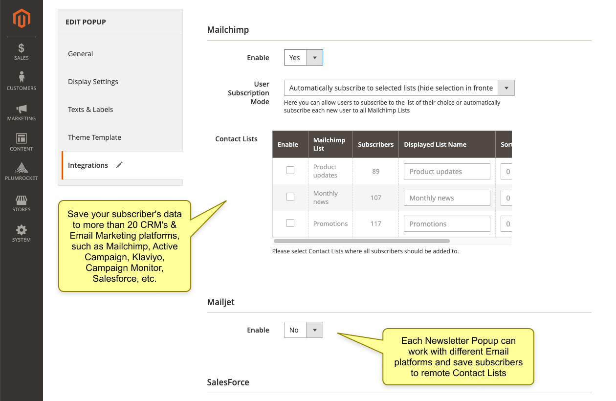 - Leverage from 20+ built-in CRM & email marketing platforms to sync & import your current newsletter subscribers. With a few clicks, you can link up with the built-in Mailchimp, GetResponse, Campaign Monitor, iContact, ActiveCampaign, and others.
