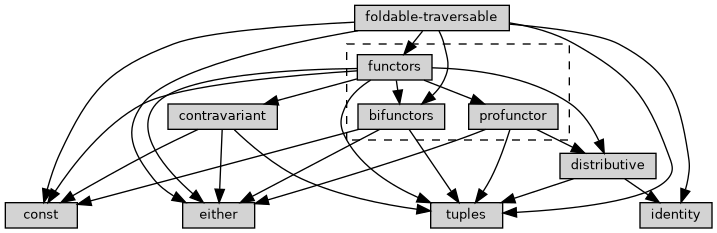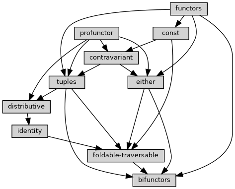 I find it a bit weird having functors depending on bifunctors and profunctor, I think having it the other way around (having both bifunctors and profunctor depend on functors) would make more sense to me. I guess that would probably require moving bifunctors and profunctor so that they depend on both either and tuples, and moving all of the bifoldable and bitraversable instances out of foldable-traversable and into bifunctors? Does that sound like it would work?