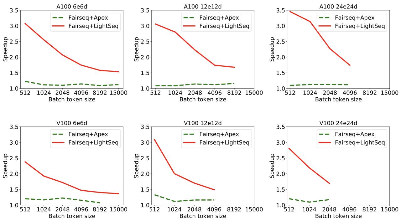 Here we present the experimental results on WMT14 English to German translation task based on Transformer-big models. We train Transformer models of different sizes on eight NVIDIA Tesla V100/NVIDIA Ampere A100 GPUs with data parallel and fp16 mixed precision. Fairseq with Apex is choosed as our baseline.