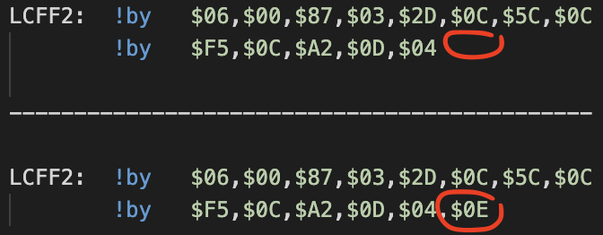 The last byte "0E" was missing in the source code, this byte belongs to the adjustment table for the Y-command