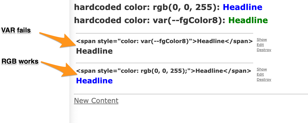 <h3>hardcoded color: rgb(0, 0, 255): <span style="color: rgb(0, 0, 255);">Headline</span></h3>