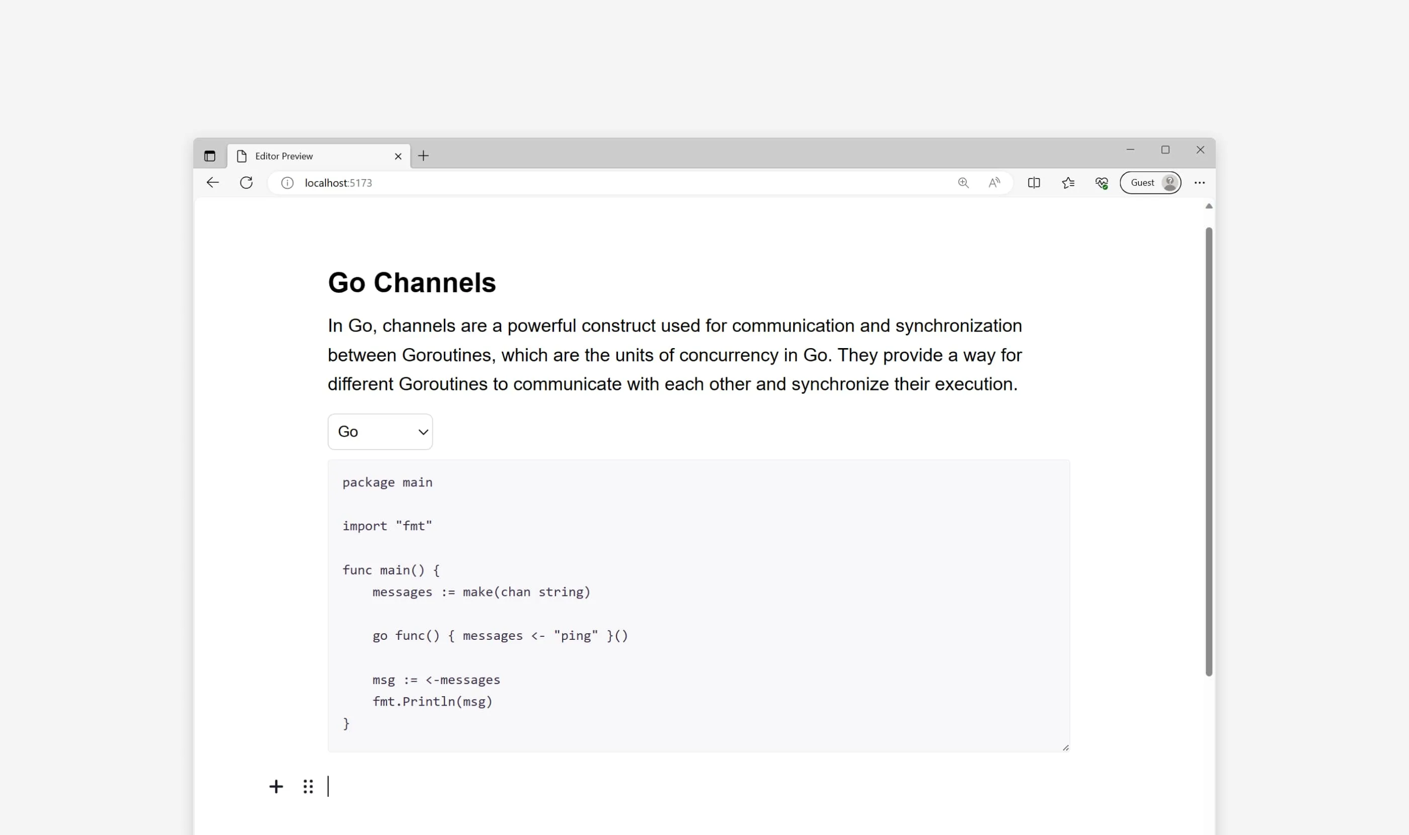 The Custom Code Plugin for Editor.js enables you to incorporate code examples into your articles, along with a dropdown for selecting the language mode.