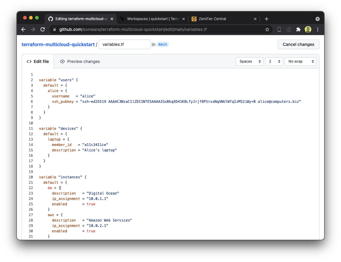 Terraform has two kinds of variables. We have already seen some Environmet Variables, which we used to make credentials available to the ZeroTier Terraform Provider. The other kinds of variables are known as Input Variables. We will use these to supply some usernames and SSH keys, as well as toggle which clouds we want to use.