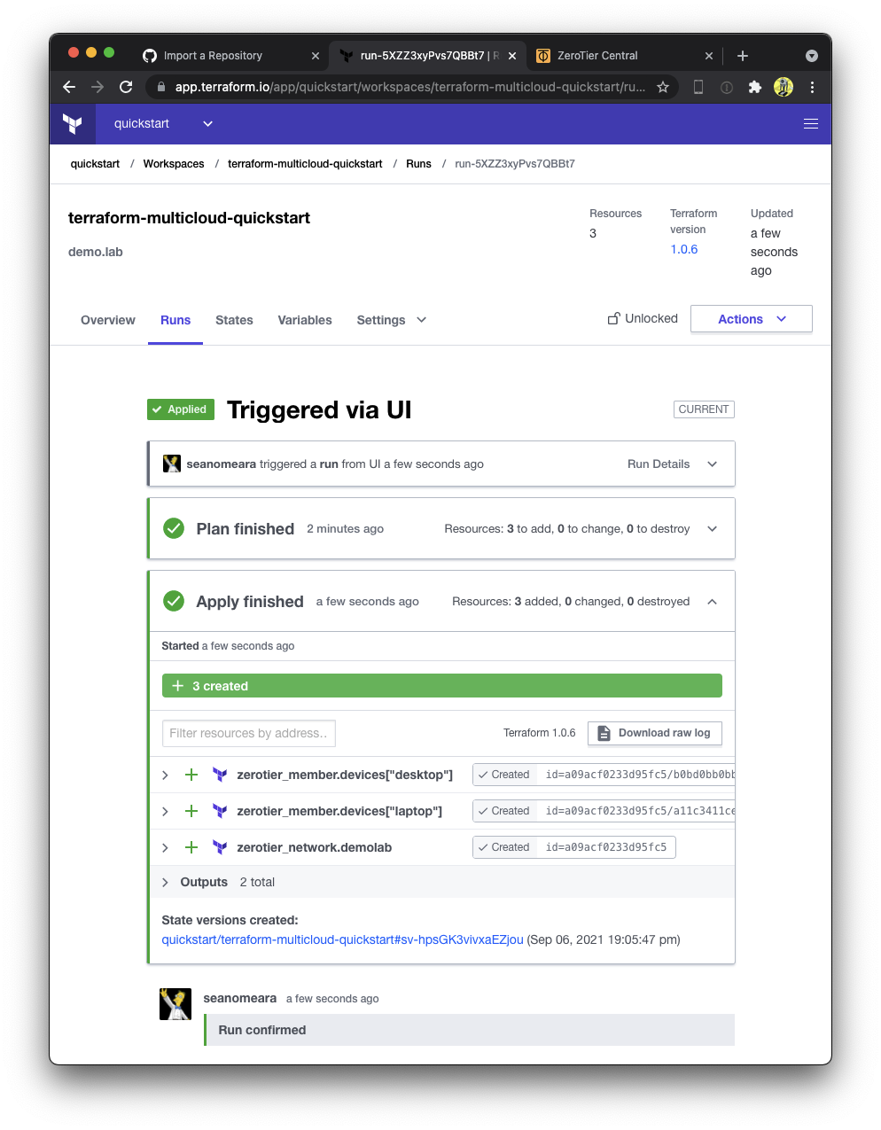 We now have pre-generated ZeroTier Identities that we will inject into our cloud instances when we bring them up. They are stored in the workspace's Terraform State on Terraform Cloud. Be careful about who has access to your account, as well as source repository that drives it.