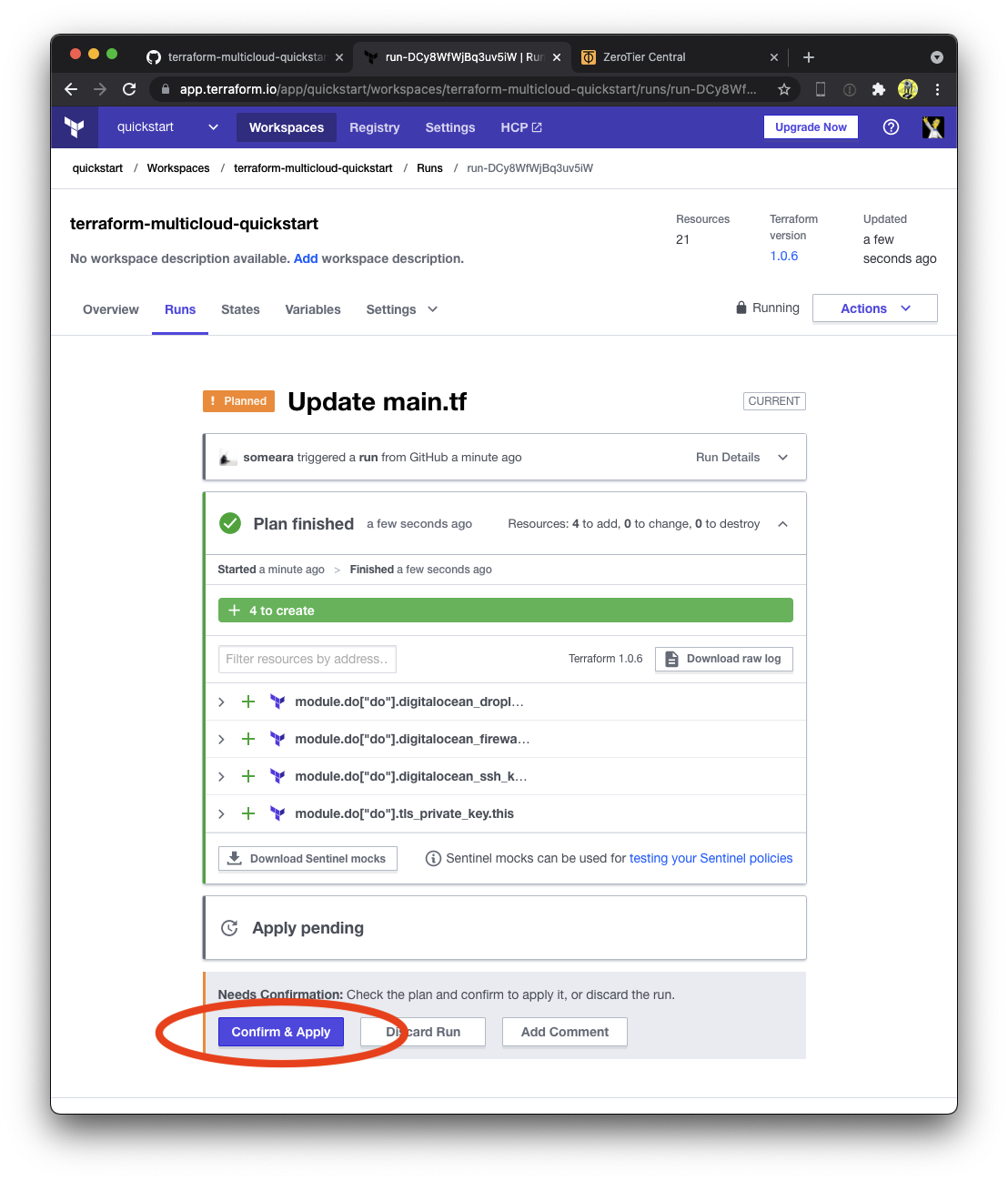Navigate through "Runs" and then "confirm and apply". There is a setting to make this step automatic, but we will leave it manual for now.