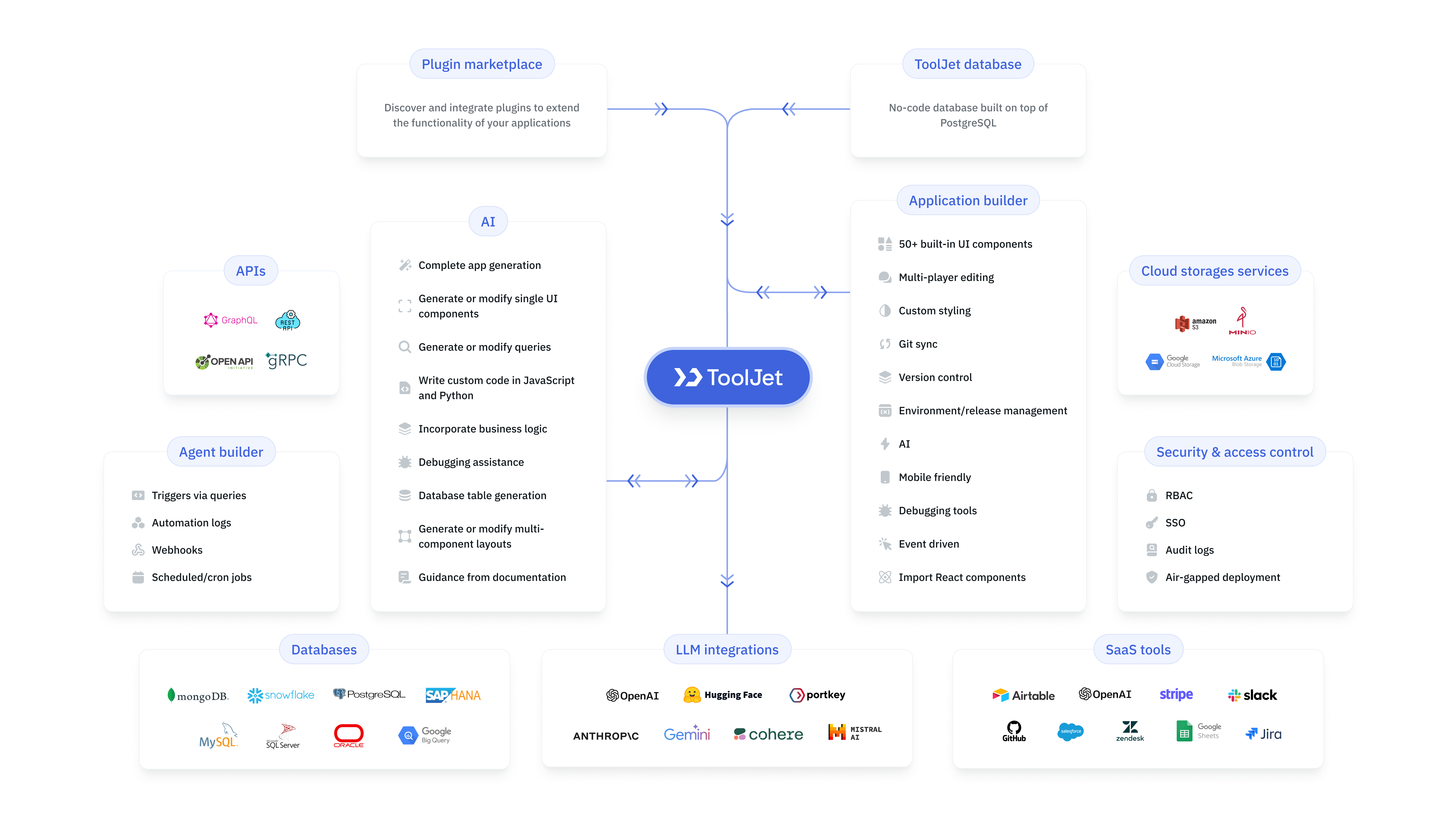 ToolJet is the open-source foundation of ToolJet AI - the AI-native platform for building and deploying internal tools, workflows and AI agents. The community edition provides a powerful visual builder, drag-and-drop UI, and integrations with databases, APIs, SaaS apps, and object storage. For AI-powered UI generation, query building, debugging, and enterprise features, see ToolJet AI.