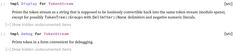 Nowadays Debug and Display implementations of TokenStream are explicitly documented, outlining the behaviour of both implementations: