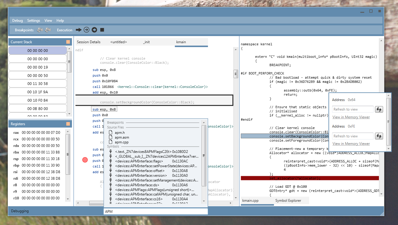 A fully-extensible graphical debugger written in C# boasting built-in integration with popular virtual machines/emulators such as Bochs and Qemu.