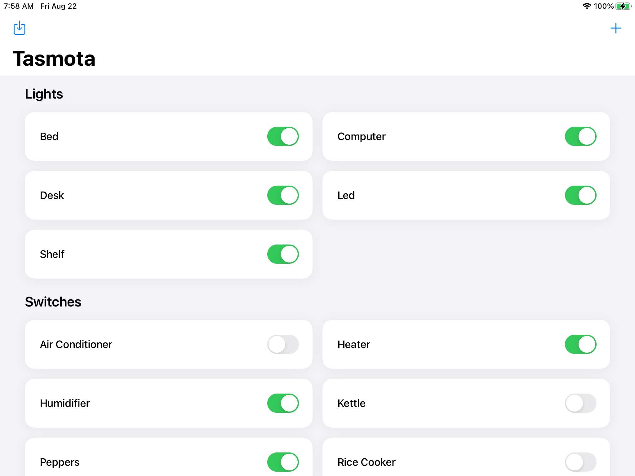 A native iOS and macOS app for controlling Tasmota-powered smart devices on your local network. Built with SwiftUI for a modern, responsive interface that adapts to different device orientations and screen sizes across iPhone, iPad, and Mac.