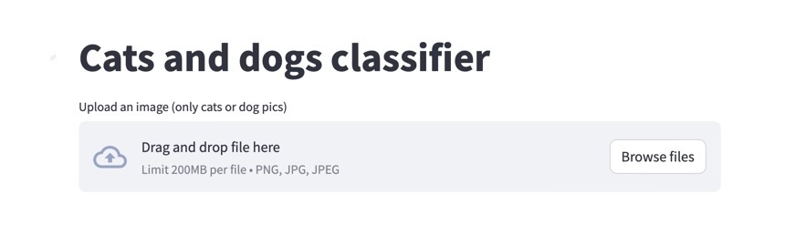 $ streamlit run src/app.pyStreamlit should open a browser window, you can upload pictures and get the model to classify them.