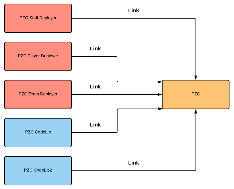 There are two stages when deploying PizzaCoin contract onto the blockchain. In the first stage, PizzaCoin contract's dependencies including PizzaCoinStaffDeployer, PizzaCoinPlayerDeployer, PizzaCoinTeamDeployer, PizzaCoinCodeLib and PizzaCoinCodeLib2 libraries have to be deployed onto the blockchain one by one as separate transactions. The previously deployed libraries' addresses would then be linked and injected as dependency instances in order to deploy PizzaCoin mother contract to the ethereum network as illustrated in Figure 1.