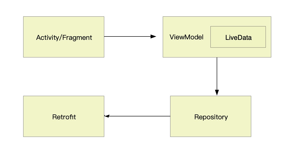 主要还是通过Retrofit+协程来完成。整个应用的数据流向架构为: