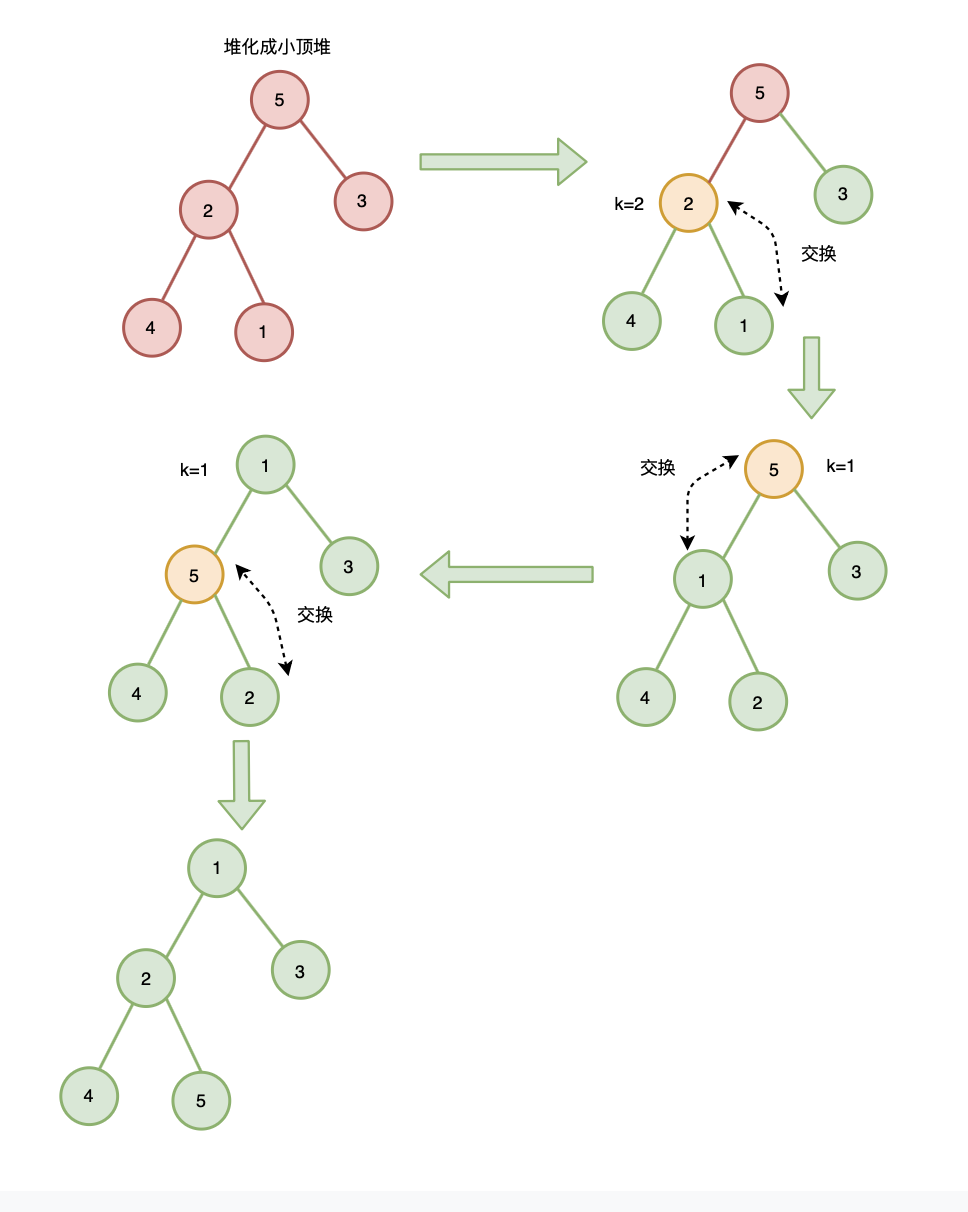 - 原地创建:又称堆化,给定一组节点,实现一个大顶堆(或小顶堆)