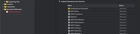 Purchases.framework also needs to be added to your iOS project. The npm install will download the correct framework version.