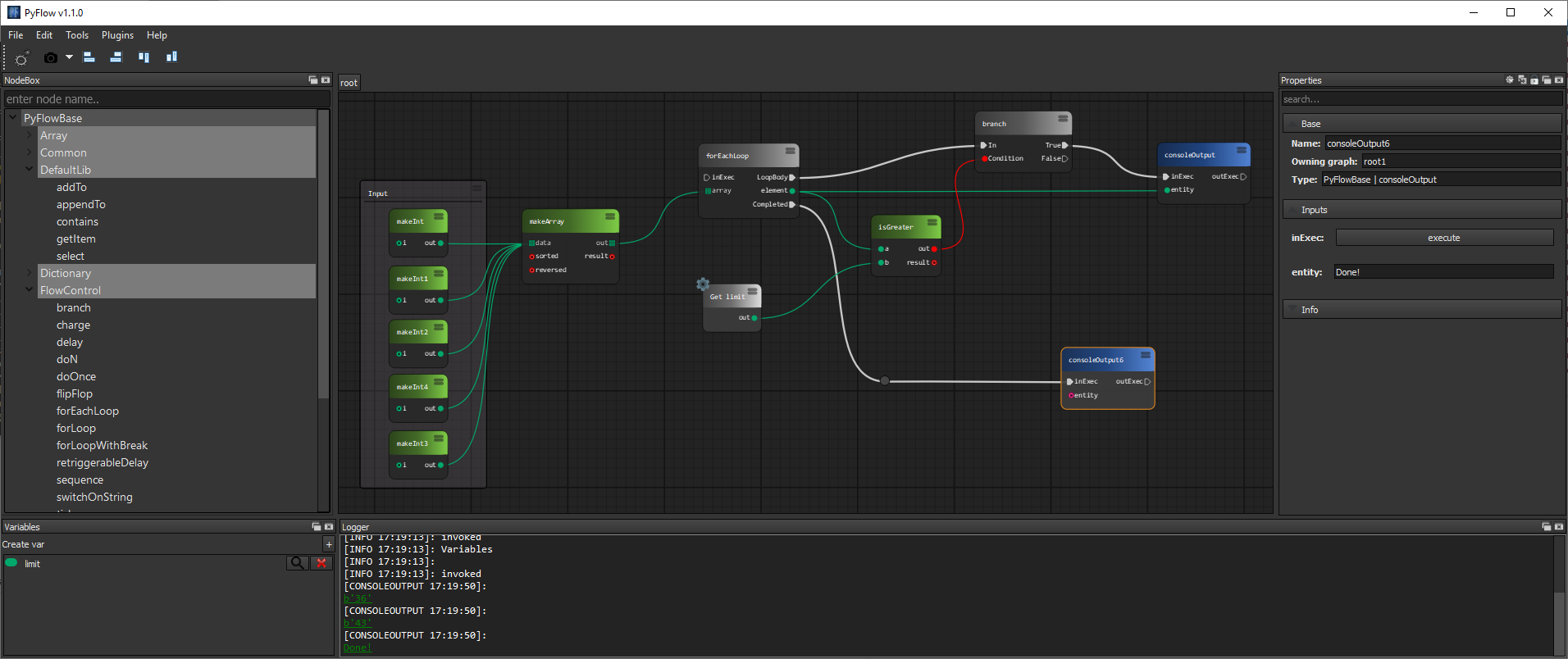Main logic elements (Node and Pin) has non gui representation, so programs can be evaluated without GUI