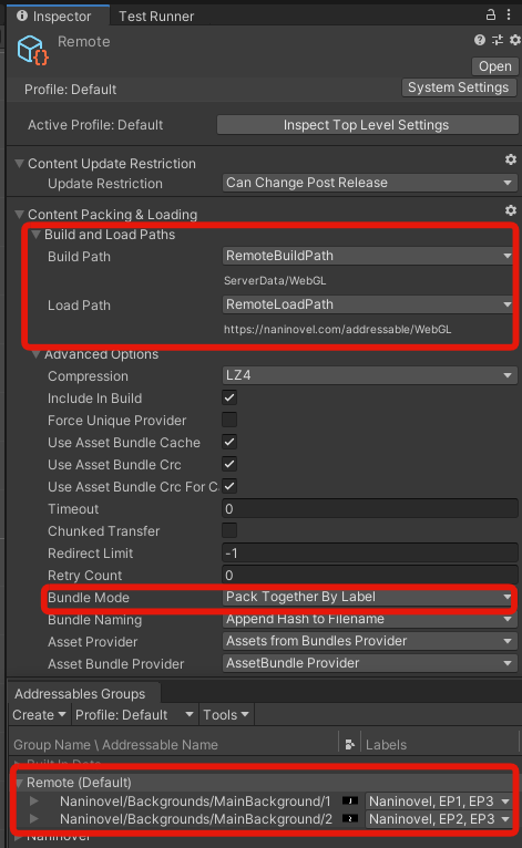 Furthermore, those two backgrounds are split between asset bundles by labels corresponding to episodes (EP1, EP2, EP3) and are loaded from a remote host: