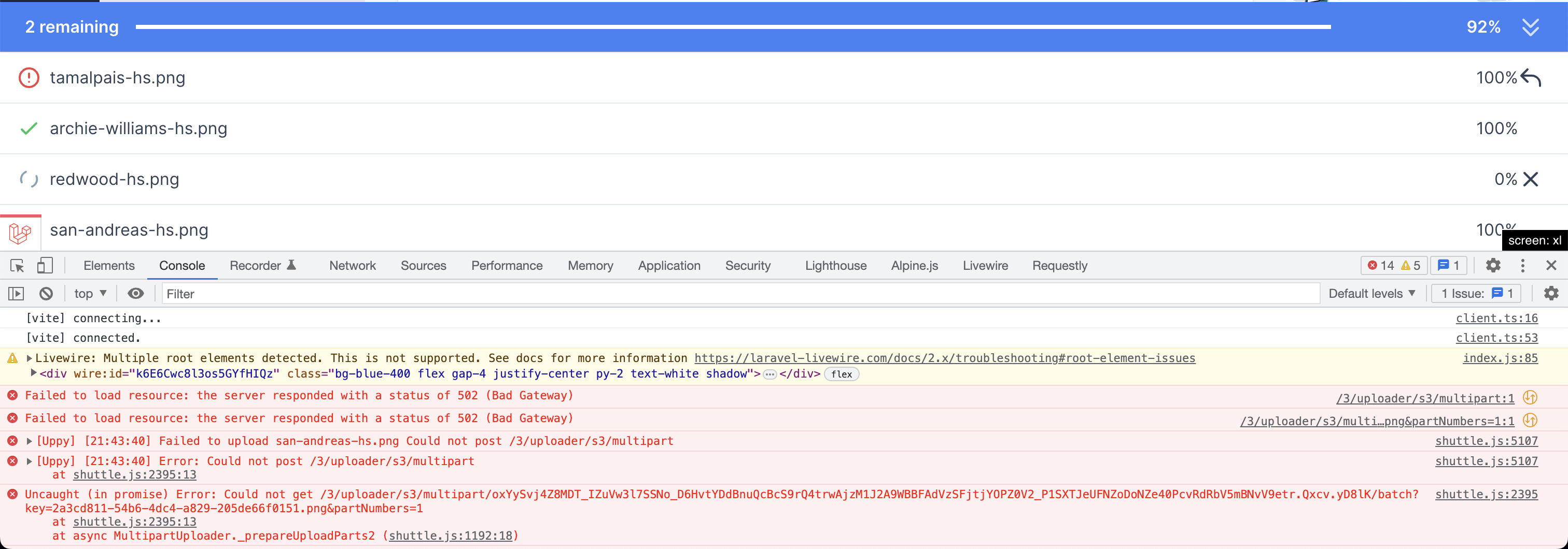 Trying to upload 4 files. 2 worked, 1 failed at 100%, 1 is just spinning in progress.