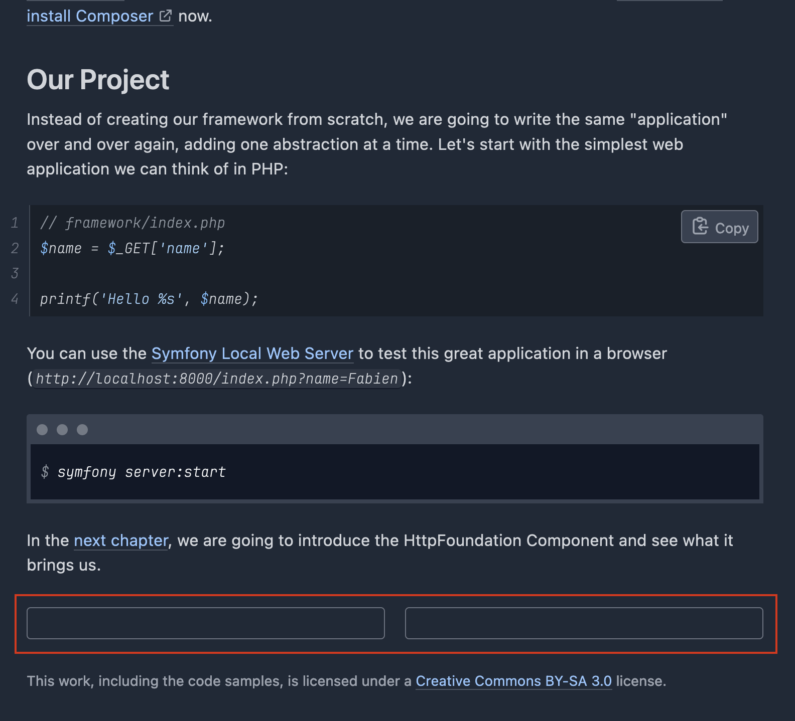 For example in https://symfony.com/doc/current/create_framework/index.html the Next and Prev buttons seems to render empty box but never really be shown and so it hard to navigate through the whole Documentation as not always the end text has a next chapter link.