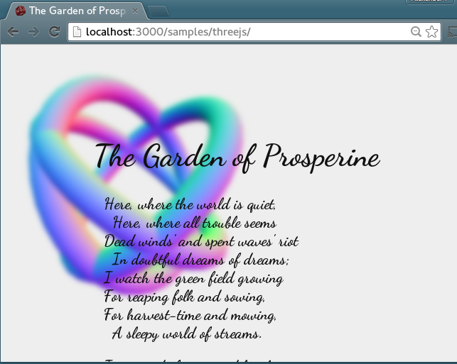One of the poems of Algernon Charles Swinburne, with three rotating tori in the background. Uses CSS3 for the Gaussian blur and three.js for the 3D graphics.