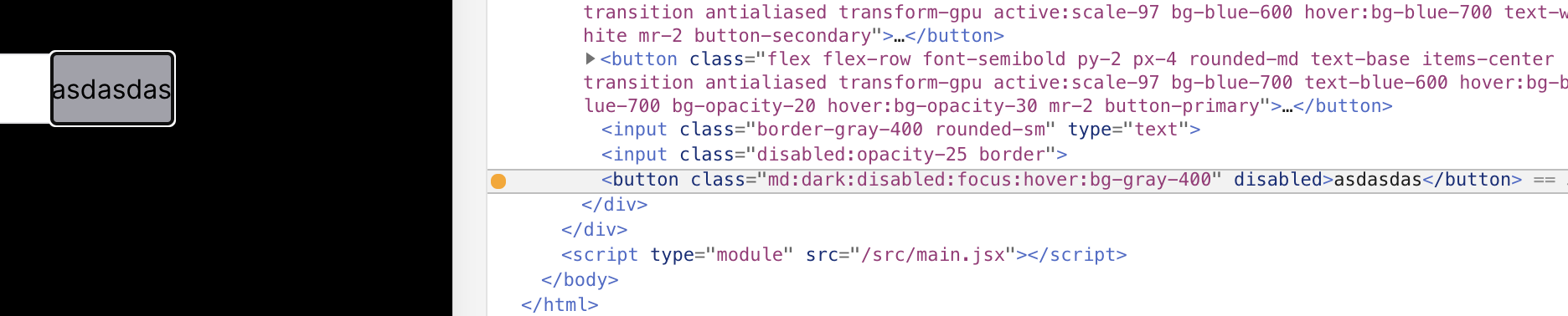 Same with the button, once I add the dark class to the HTML element and make the button disabled, the styles kick in on hover+focus at the md breakpoint: