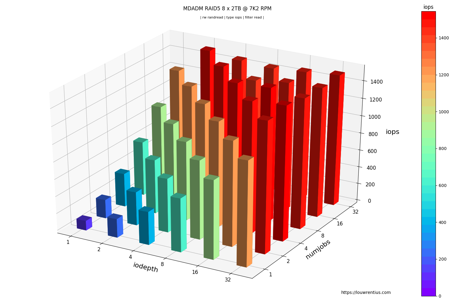 A 3D bar chart that plots both queue depth an numjobs against either latency or IOPs.