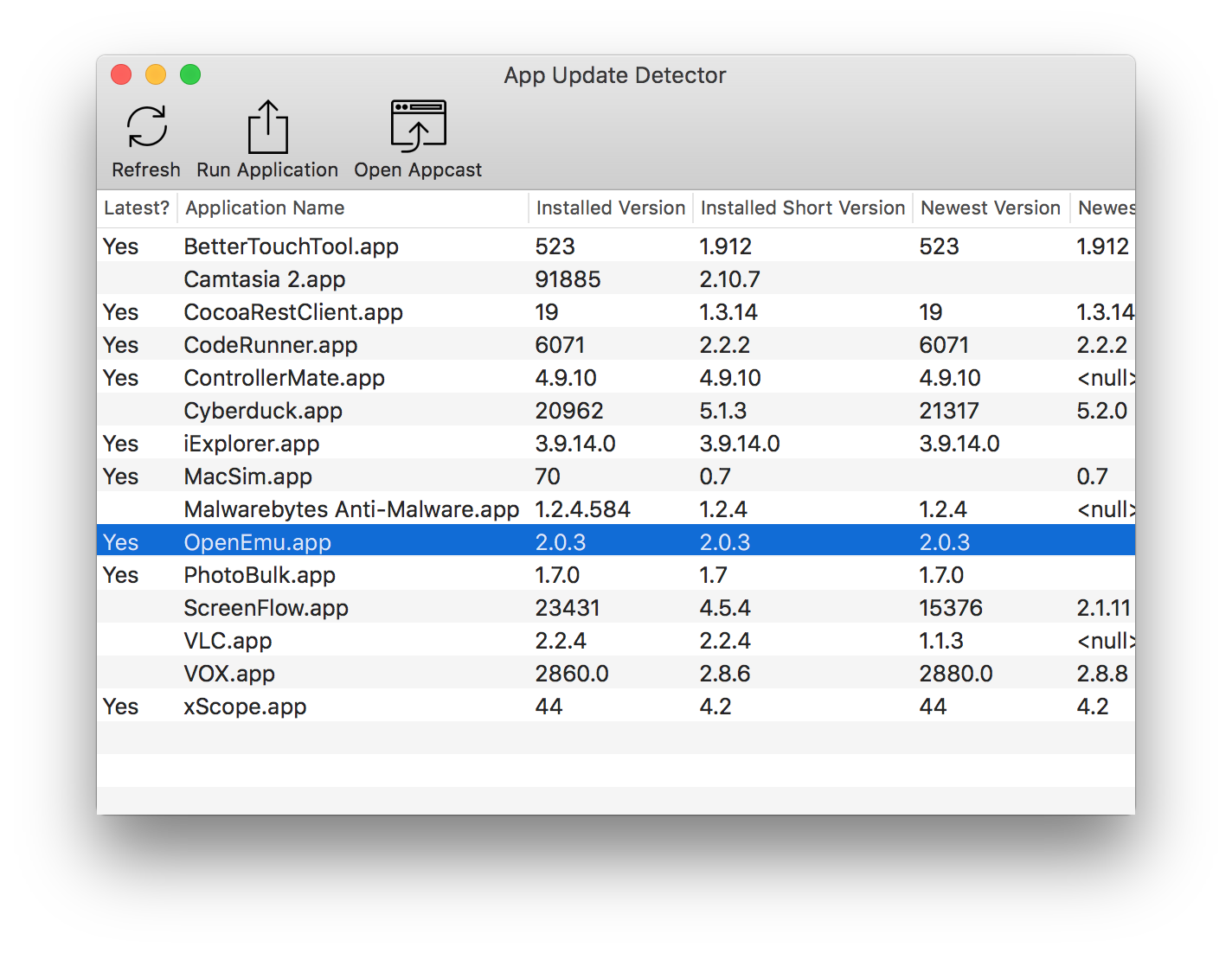 AUD (App Update Detector) is a program for Mac OS X 10.9+ that detects for updates for any program that uses the Sparkle framework. This scans in the /Applications folder.