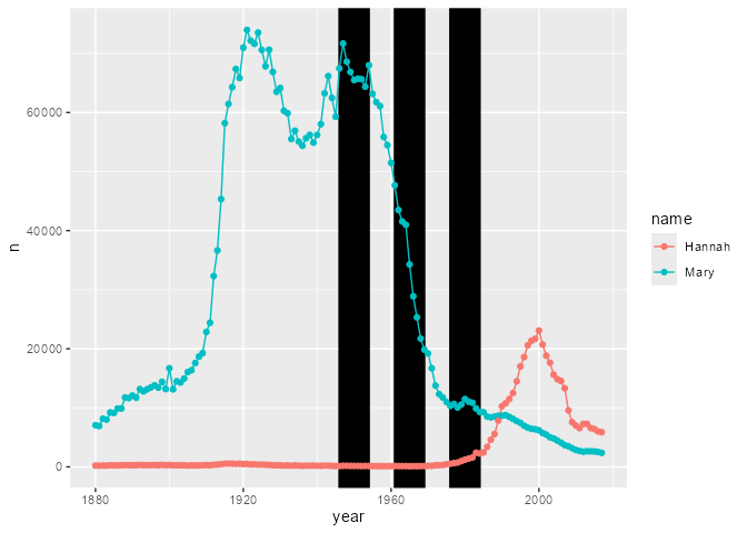 dplyr::filter(name %in% c("Mary", "Hannah"), sex == "F") |>