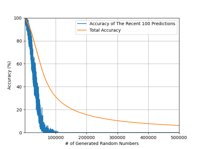 When I plot the accuracy of recent 100 predictions, the plot drops much faster than the total accuracy. And IMHO this is a more appropriate measure when discussing prediction accuracy.