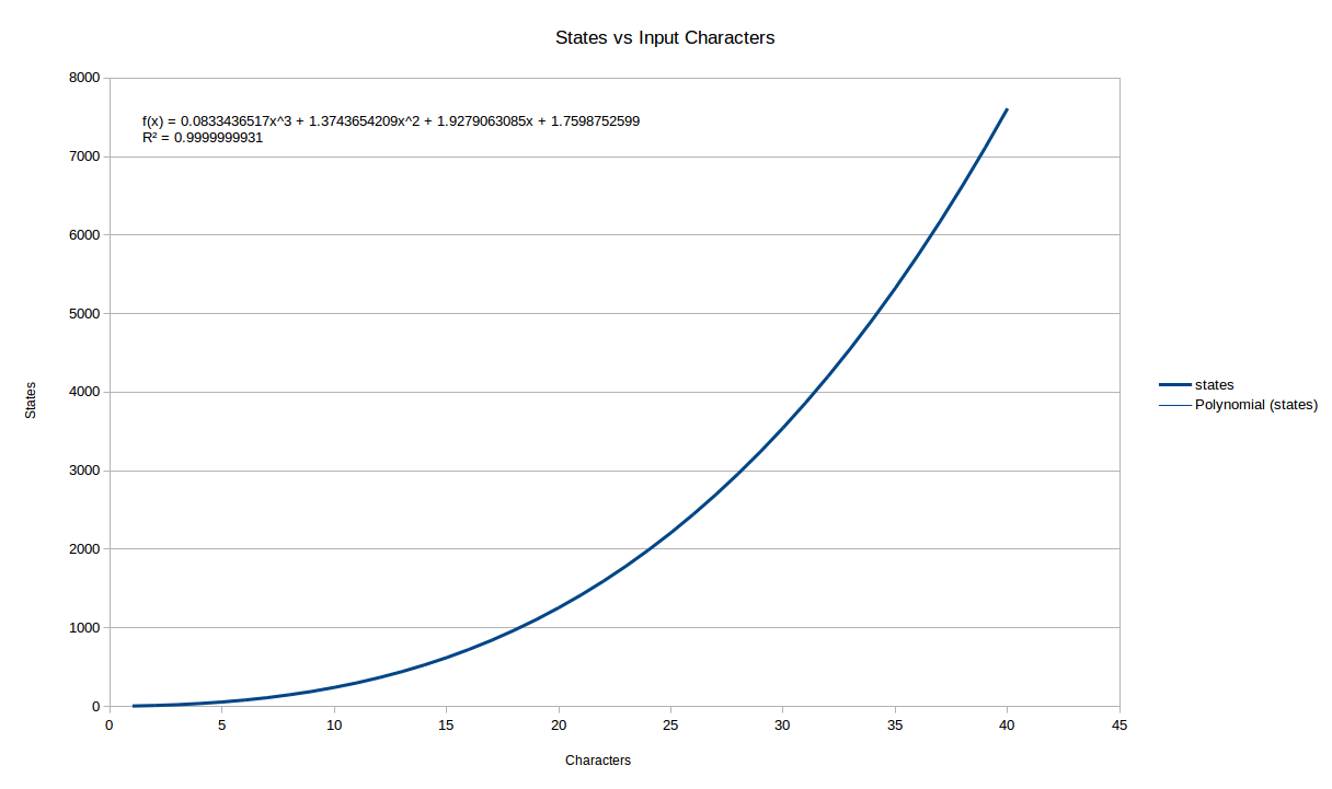 Based on the earlier analysis, we expect at worst O(n^(2k+1)) states, and in fact this is a perfect match for 3-rd degree polynomial in n, as R^2=0.999999... shows. So in fact this regex hits our upper bound, so we can consider that bound tight, at least for the k=1 case.
