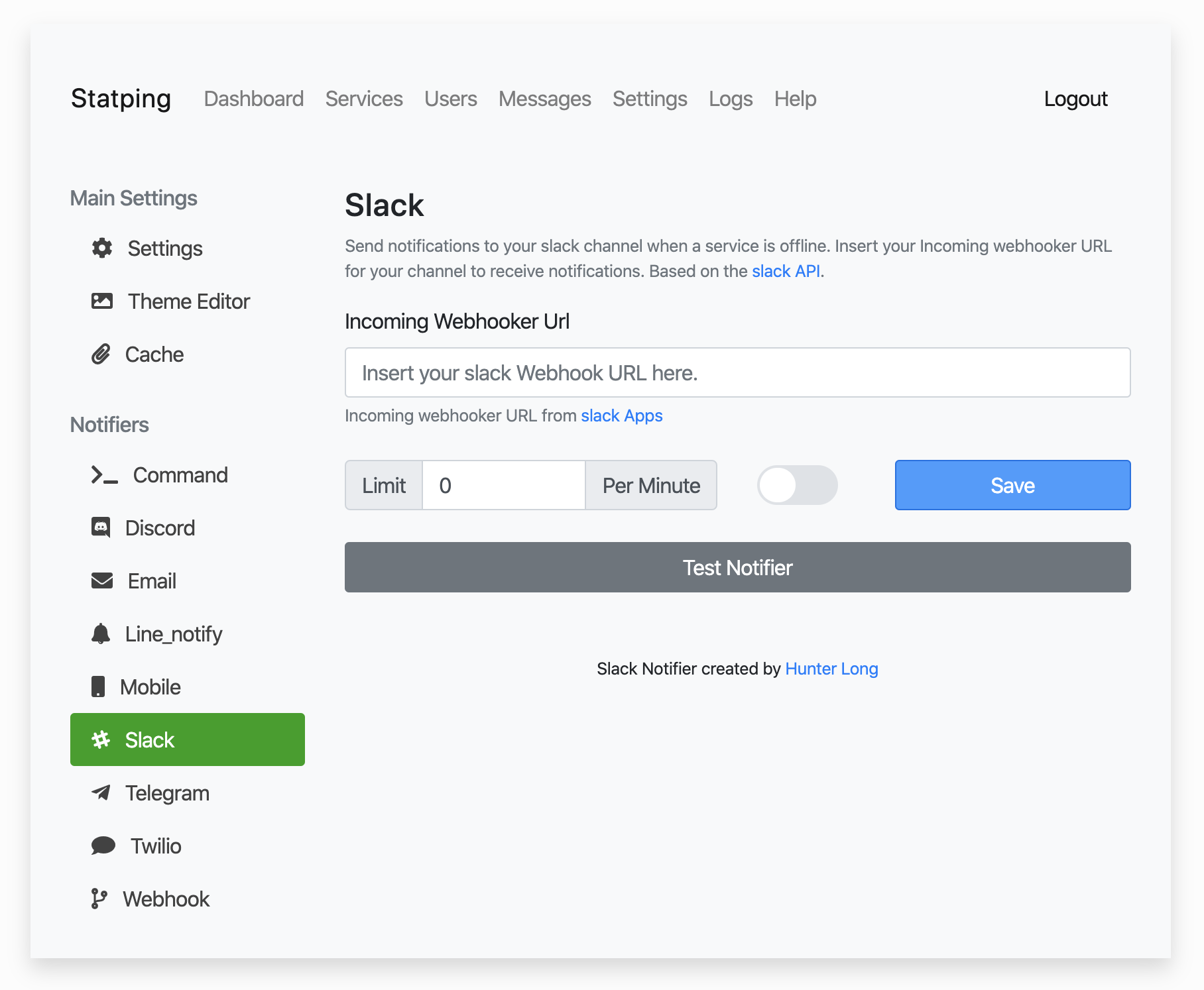 Statping includes email notification via SMTP and Slack integration using Incoming Webhook. Insert the webhook URL into the Settings page in Statping and enable the Slack integration. Anytime a service fails, you're channel that you specified on Slack will receive a message.