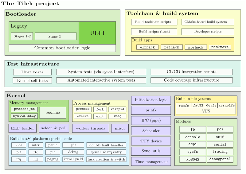 Tilck has a simple but full-featured (both soft and hard links, file holes, memory mapping, etc.) ramfs implementation, a minimalistic devfs implementation, read-only support for FAT16 and FAT32 (used for initrd) allowing memory-mapping of files, and a sysfs implementation used to provide a full view of ACPI's namespace, the list of all PCI(e) devices and Tilck's compile-time configuration. Clearly, in order to work with multiple file systems at once, Tilck has a simple VFS implementation as well. Note: there is no support for block devices in Tilck yet, so everything is in-memory.