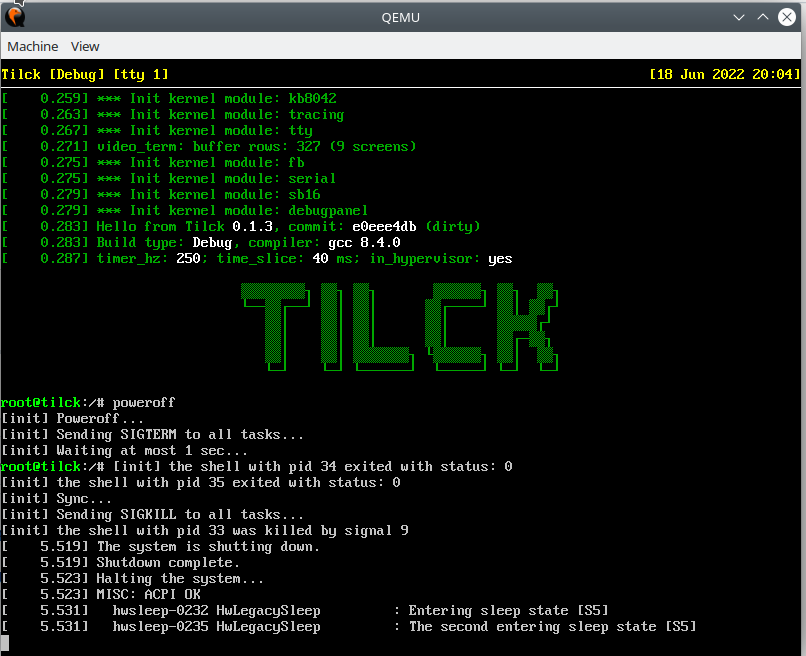 Anyway, I have to ask again the same question of above: can you really reproduce a problem with poweroff on QEMU? Does QEMU in any case hang instead of powering off the machine and closing the window? I'm really curious to know how you got the QEMU screenshot you attached here. I expect at least on QEMU poweroff to work in 100% of the cases, because it's impossible for me to test Tilck on all the HW machines, but at least on QEMU where the (virtual) machine should be always the same, Tilck must behave correctly. In case it doesn't, I'll fix the bug, if you give me enough context to reproduce it.